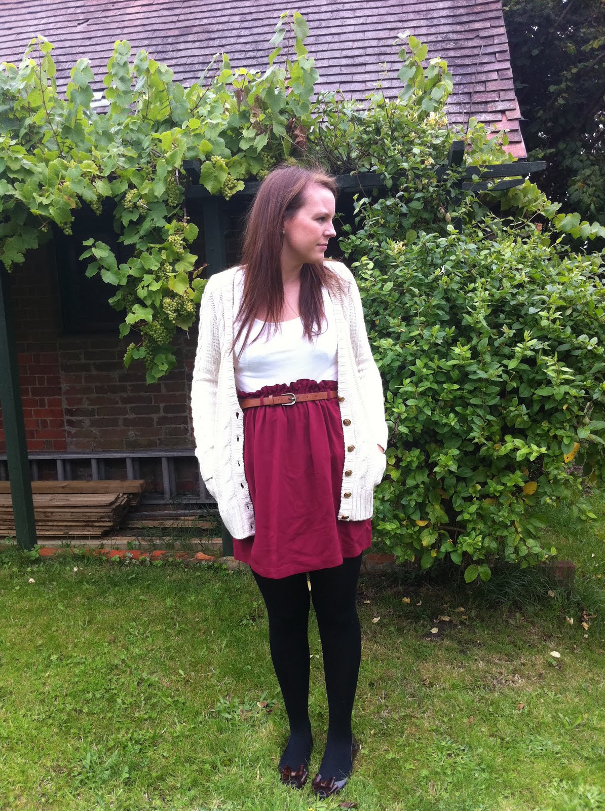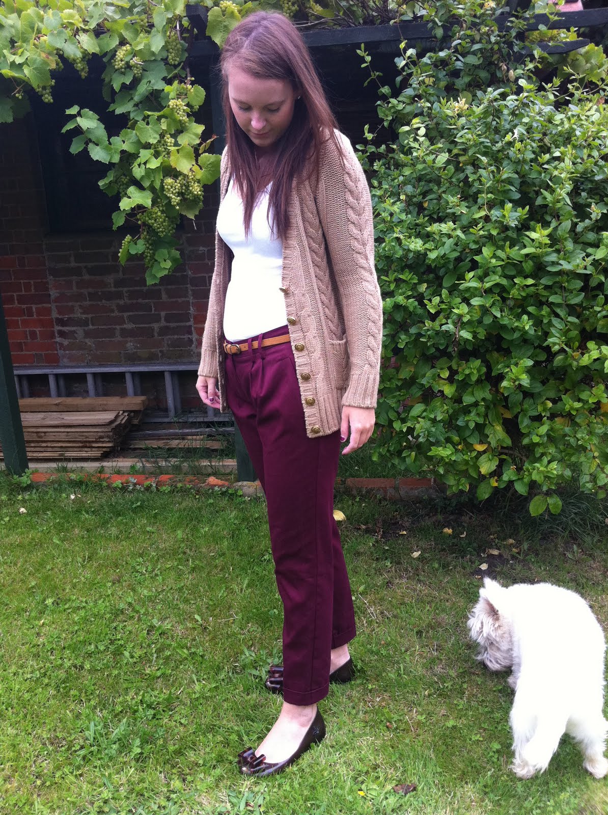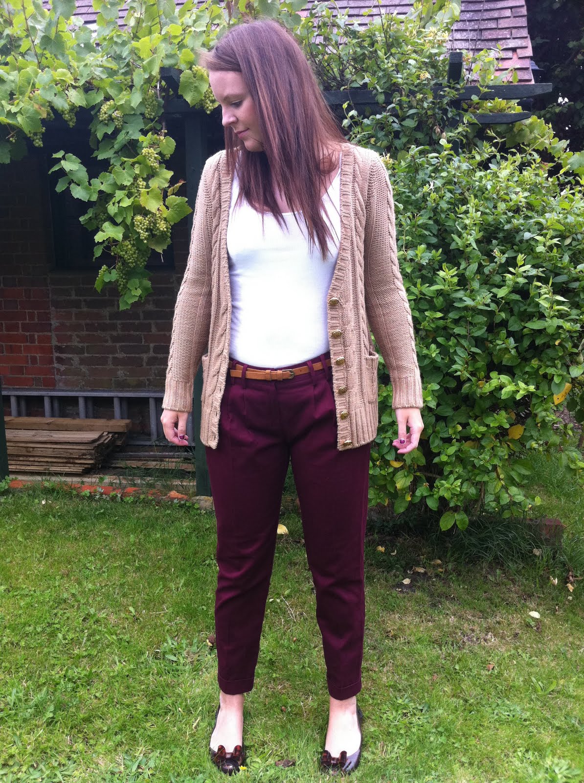 I already bought this skirt in pale pink over the summer, but as soon as i clapped eyes on this dark red version i had to have it. Worn with tan brogues and a sharp blazer/snuggly cardi.