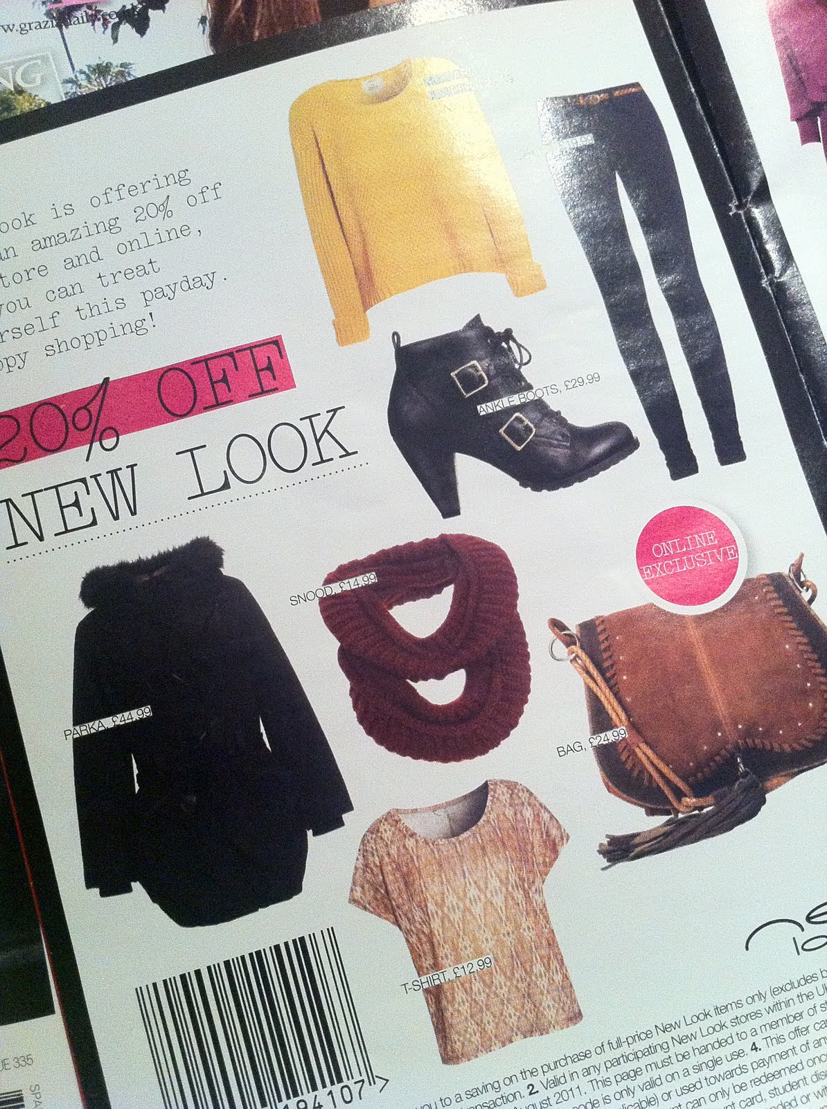 This weeks Grazia magazine offers readers a 20% voucher at New Look, perfect timing with all the lovely a/w ranges appearing in store! Its dated from the 23rd-29th August, and the offer can be used online with the code: 20GRAZ at the checkout between the 26th-28th. I eagerly snapped one up yesterday and frogmarched straight in-store to pick up some pieces (watch this space), i then went to Tescos and spotted the pull out voucher lying on the floor, ahem, so no doubt i'll be going back in again!
