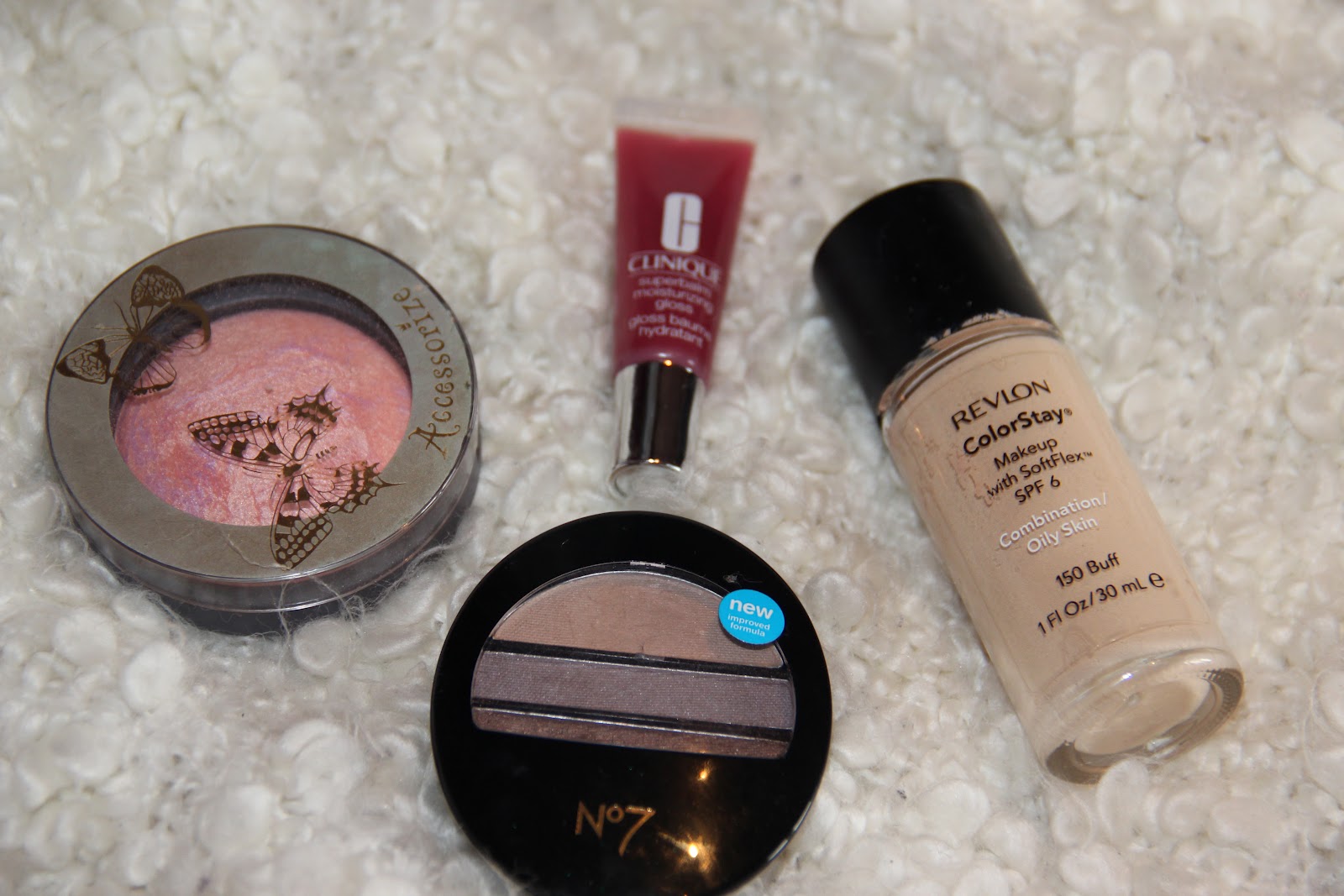 Acessorize Blush in Pretty Pink / No7 Eyeshadow Set in Cappuccino / Clinique Super Balm in Berry / Revlon Colour Stay