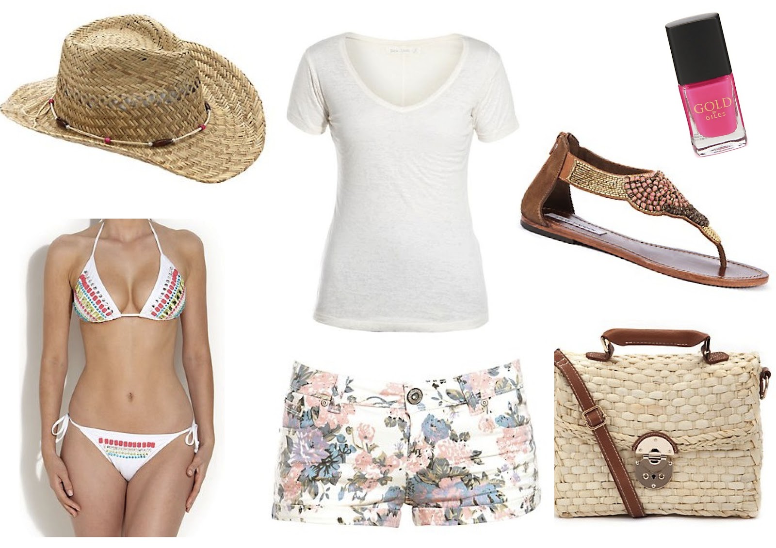 Hat (£2.00) / Bikini (£30.00) / T-shirt (£5.99) / Nail Varnish (£2.99) / Steve Madden Sandals (£35.00) / Bag (£16.99) / Shorts (£9.00)