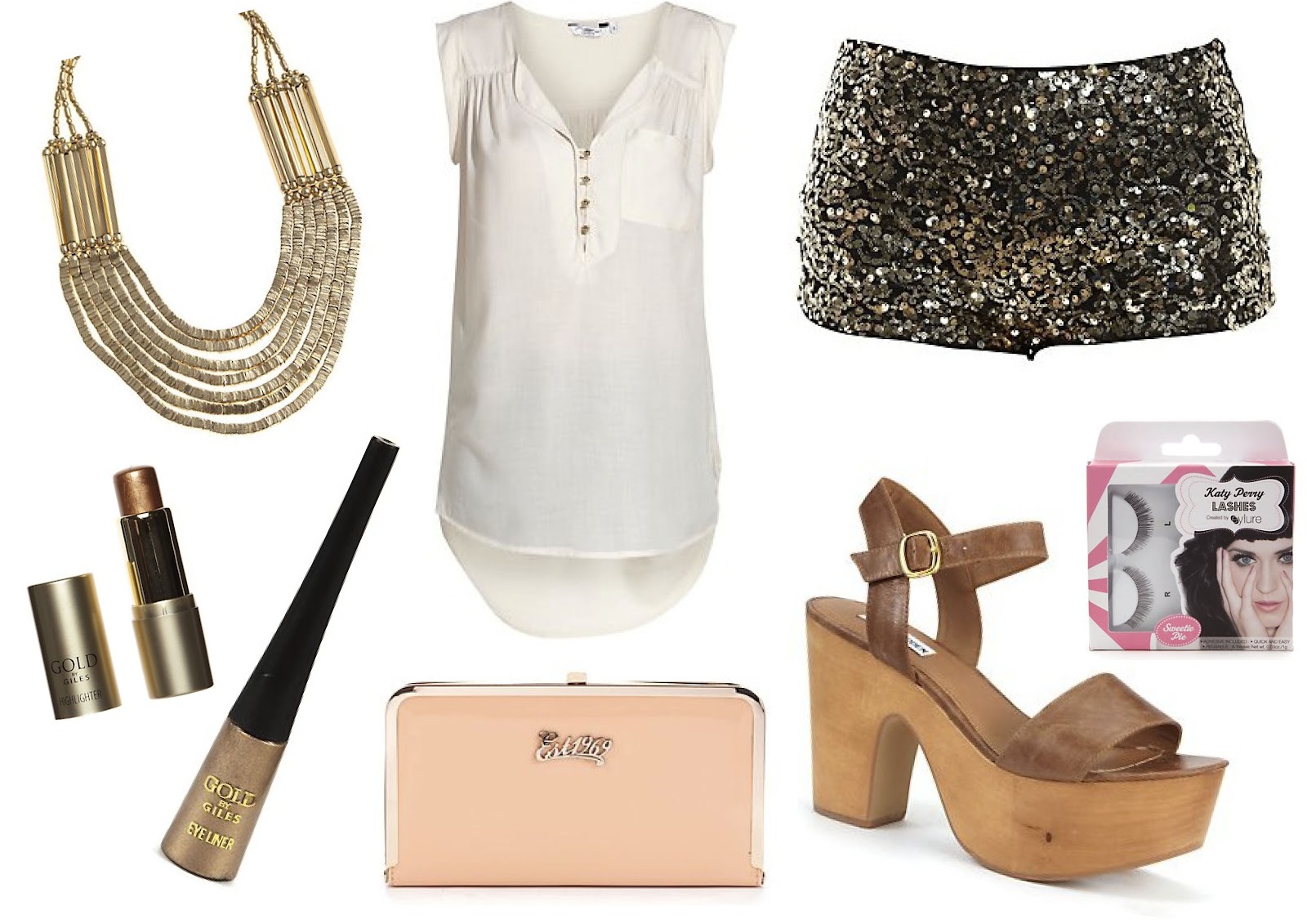 Necklace (£14.99) / Highlighter (£2.99) / Eyeliner (£2.99) / Blouse (£19.99) / Clutch (£24.99) / Sequin Shorts (£17.99) / Eyelashes (£4.99) / Shoes (£42.00)
