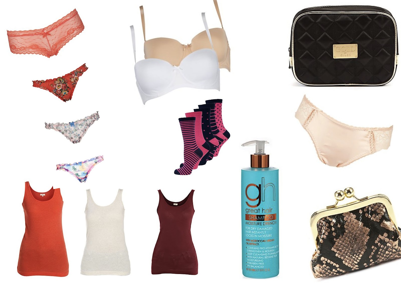 Vest (£3.99) / Knickers (from £2.99) / Nude Knickers (£5.99) / Nude Bras (£11.99) / PJs (£9.99) / Socks (£4.99) / Coin Purse (£4.99) / Moroccan Oil Shampoo (£5.99) / Foot Gel Cushions (£3.50) / Cosmetic Bag (£7.99)