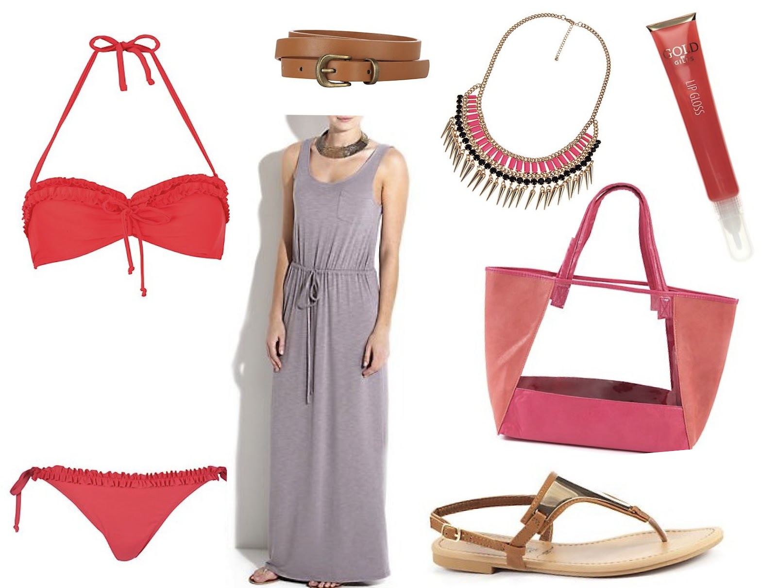 Bikini (£9.99) / Dress (£16.99) / Belt (£2.99) / Necklace (£14.99) / Lipgloss (£1.99) / Bag (£9.00)