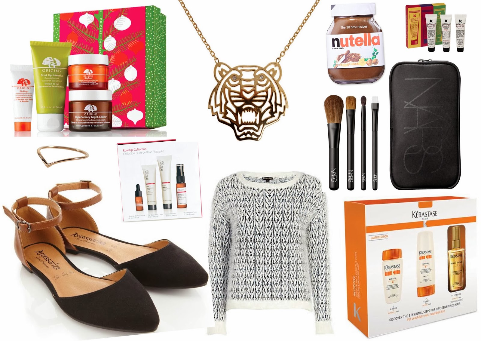 Morning to Midnight Set - Origins £40 ∙ Kenzo Tiger Necklace - Liberty £125 ∙ Nutella Recipe Book - Urban Outfitters £8.99 ∙ Rose Hip Collection - Trilogy £20.50 ∙ Brush Set - Nars £55 ∙Above Knuckle Ring - The Bohemian Collective £26 ∙ Shoes - Acessorize £25 ∙ Jumper - River Island £35 ∙ Hair Set - Kerastace £30.95