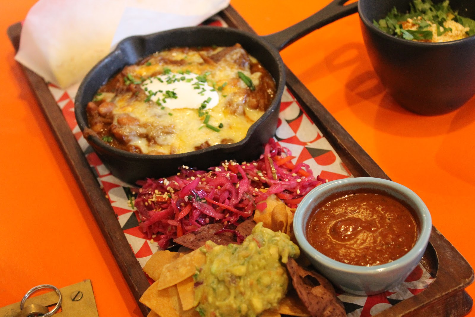 Two crispy tacos arrived promptly, with soft tender steak with a topping of salsa, salad and guacamole. If there was ever a winning combination, this was it. I'm not normally a steak girl, but after my recent American adventure, I was delighted to report back that the marinated steak pieces were cooked to perfection. With a heavy helping of chilli fries, the dusted chilli powder skin-on-fries kind, it was like a spice party in my mouth (did I really just type that?).