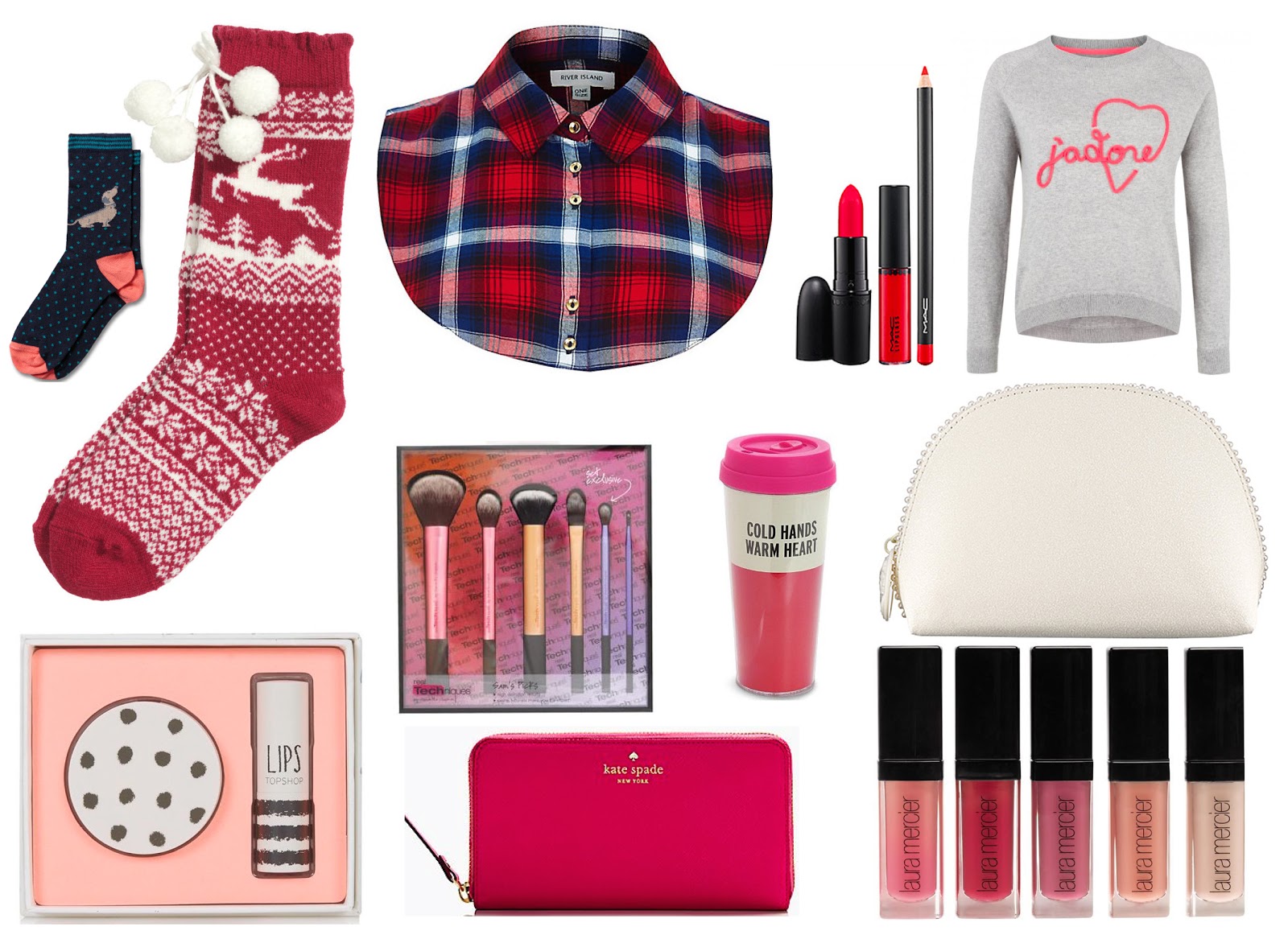 Buster Dog Socks - Oliver Bonas ∙ Christmas Socks - H&M ∙ Shirt Collar Insert - River Island ∙ Red Lip Set - MAC ∙ J'adore Jumper - Oliver Bonas ∙ Brush Set - Feel Unique ∙ Lip & Cheek Set - Topshop ∙ Thermal Mug - Kate Spade ∙ Purse - Kate Spade ∙ Lipgloss Set - Laura Mercier