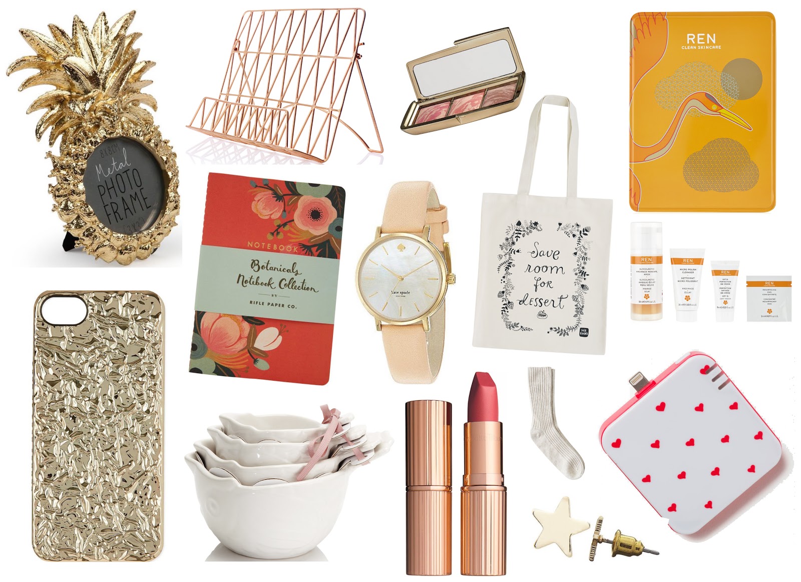 Pineapple Photo Frame - Paperchase ∙ Coper Wire Recipe Stand - Oliver Bonas ∙ Note Books - Rifle Paper Co ∙ Watch - Kate Spade ∙ Blush Palette - Hourglass ∙ Tote Bag - Alphabet Bags ∙ Radiance Gift Set - Ren ∙ Foil iPhone Case - Marc Jacobs ∙ Owl Measuring Cups - M&S ∙ Lipstick - Charlotte Tillbury ∙ Cashmere Socks - Warehouse ∙ Star Earrings - John Lewis ∙ iPhone Charger - Anthroplogie