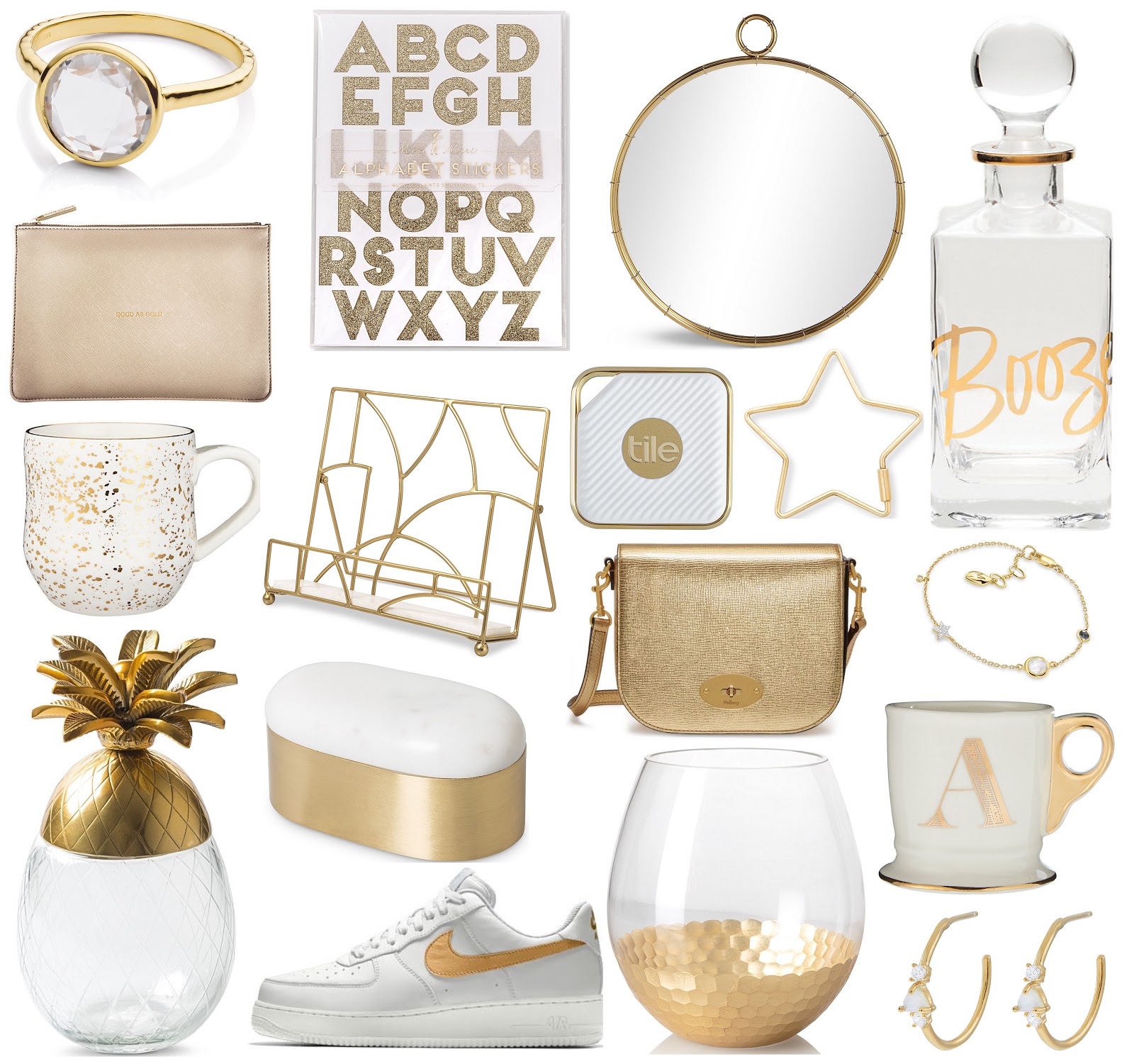 Luna ring - Monica Vinader ∙ Alphabet stickers - Oliver Bonas ∙ Mirror - M&S ∙ Decanter - John Lewis ∙ Star keyring - Oliver Bonas ∙ Mini tracker - Tile ∙ Recipe stand - Oliver Bonas ∙ Pouch - Katie Loxton ∙ Gold speck mug - Anthropologie ∙ Pineapple - Oliver Bonas ∙ Brass and marble desk pot - Oliver Bonas ∙ Small Darley satchel gold - Mulberry ∙ Instella bracelet - Missoma ∙ Monogram mug - Anthropologie ∙ Opal hoop earrings - Accessorize ∙ Gold vase - Oliver Bonas ∙ Gold air force ones - Nike