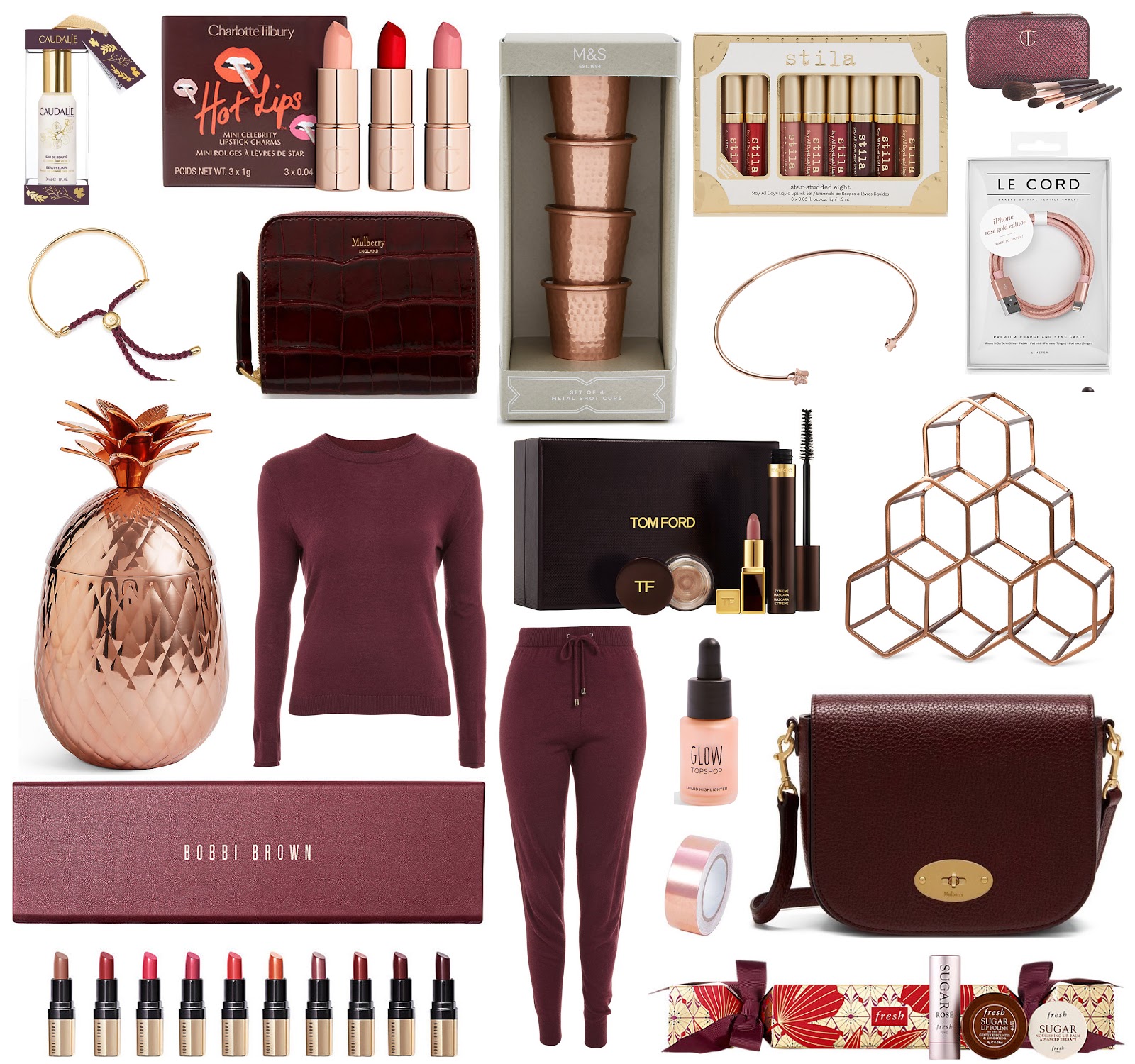 Face spray cracker - Caudalie ∙ Mini lipsticks - Charlotte Tilbury ∙ Shot glasses - M&S ∙ Liquid lipstick set - Stila ∙ Mini brush set - Charlotte Tilbury ∙ iPhone Cable - Oliver Bonas ∙ Star bangle - Hush ∙ Purse - Mulberry ∙ Fiji bracelet - Monica Vinader ∙ Wine Cashmere blend jumper - Topshop ∙ Pineapple vase - Oliver Bonas ∙ Wine cashmere blended joggers - Topshop ∙ Golden rose set - Tom Ford ∙ Copper wine rack - Oliver Bonas ∙ Small Darley satchel oxblood - Mulberry ∙ Glow highlighter - Topshop ∙ Copper tape - Quill ∙ Lipstick collection - Bobbi Brown ∙ Cracker - Fresh