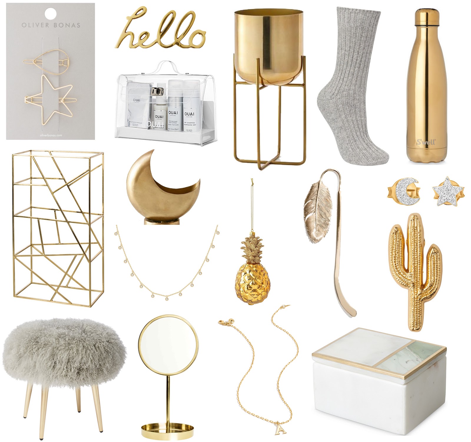 Star & teardrop hair clips - Oliver Bonas ∙ Hello - West Elm ∙ Standing gold planter - West Elm ∙ Cashmere bed socks - John Lewis ∙ Gold water bottle - Swell ∙ Moon and star studs - Missoma ∙ Cactus pin - Whistles ∙ Feather bookmark - & Other Stories ∙ Pineapple - Oliver Bonas ∙ After morning kit - OUAI ∙ Half moon planter - Urban Outfitters ∙ Grid wine rack - Oliver Bonas ∙ Footstool - West Elm ∙ Instella drop necklace - Missoma ∙ Mirror - H&M ∙ Gold letter necklace - J Crew ∙ Green and marble jewellery box - Oliver Bonas