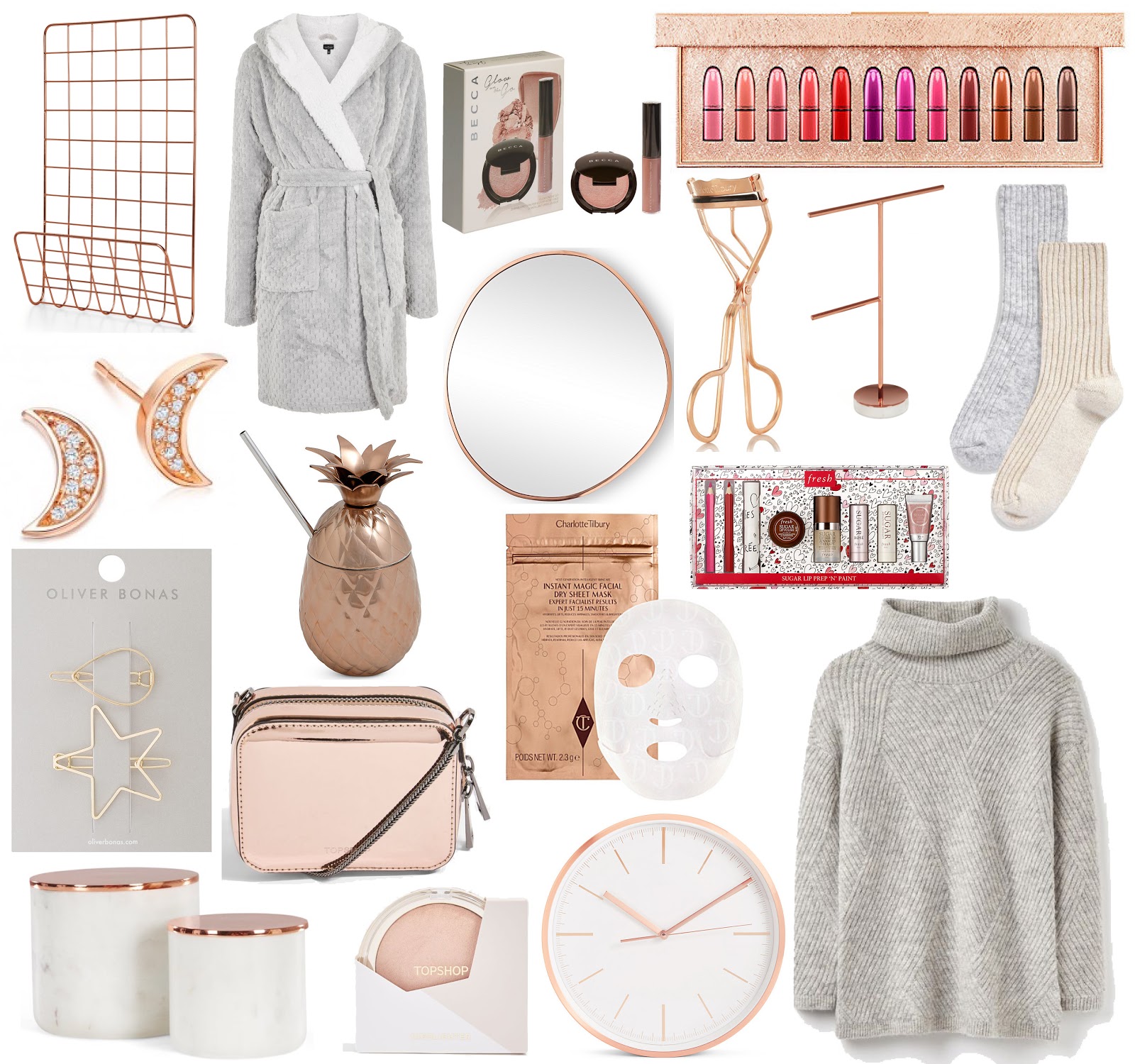 Memo board - Made ∙ Grey dressing gown - Topshop ∙ Highlighter set - Becca ∙ Lipstick vault - Mac ∙ Cashmere mix socks - Next ∙ Jewellery stand - MADE ∙ Eyelash curlers - Charlotte Tilbury ∙ Copper mirror - Oliver Bonas ∙ Pineapple ice bucket - M&S ∙ Mini moon stud - Astley Clarke ∙ Star & teardrop hair clips - Oliver Bonas ∙ Rose gold bag - Topshop ∙ Face mask - Charlotte Tilbury ∙ Lip 'n prep - Fresh ∙ Jumper - Joules ∙ Copper clock - M&S ∙ Highlighter - Topshop ∙ Marble pots - Made